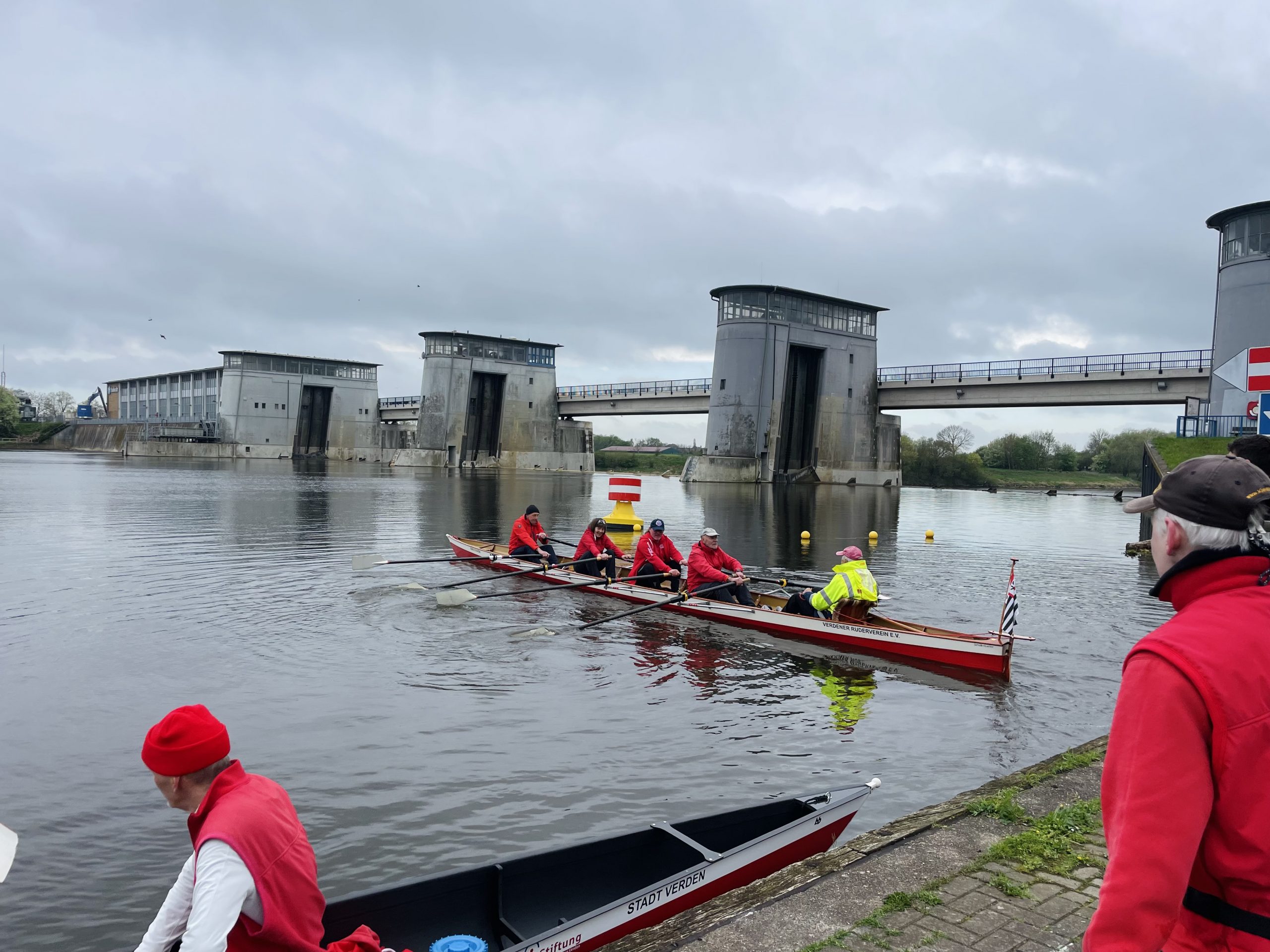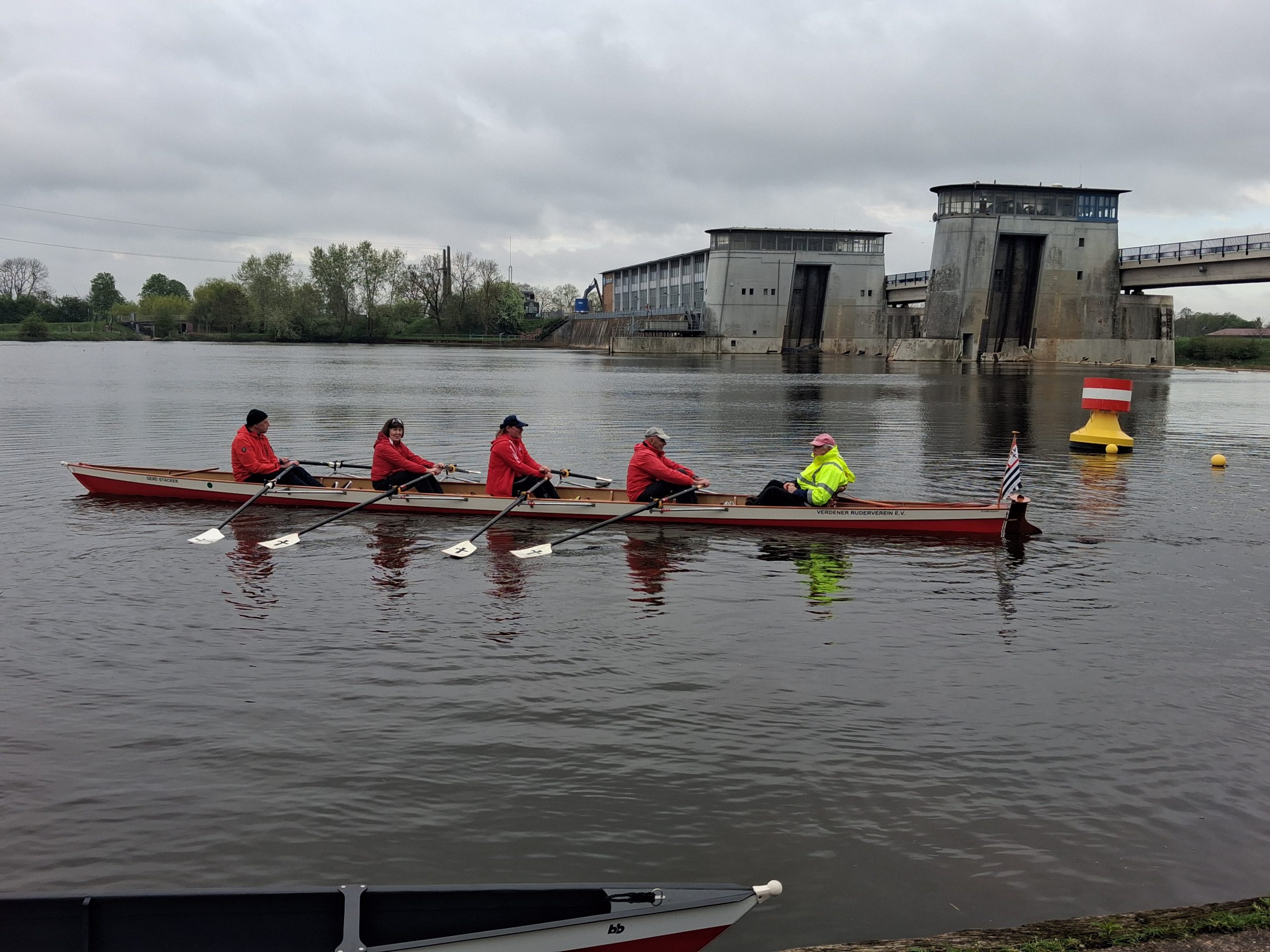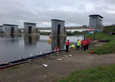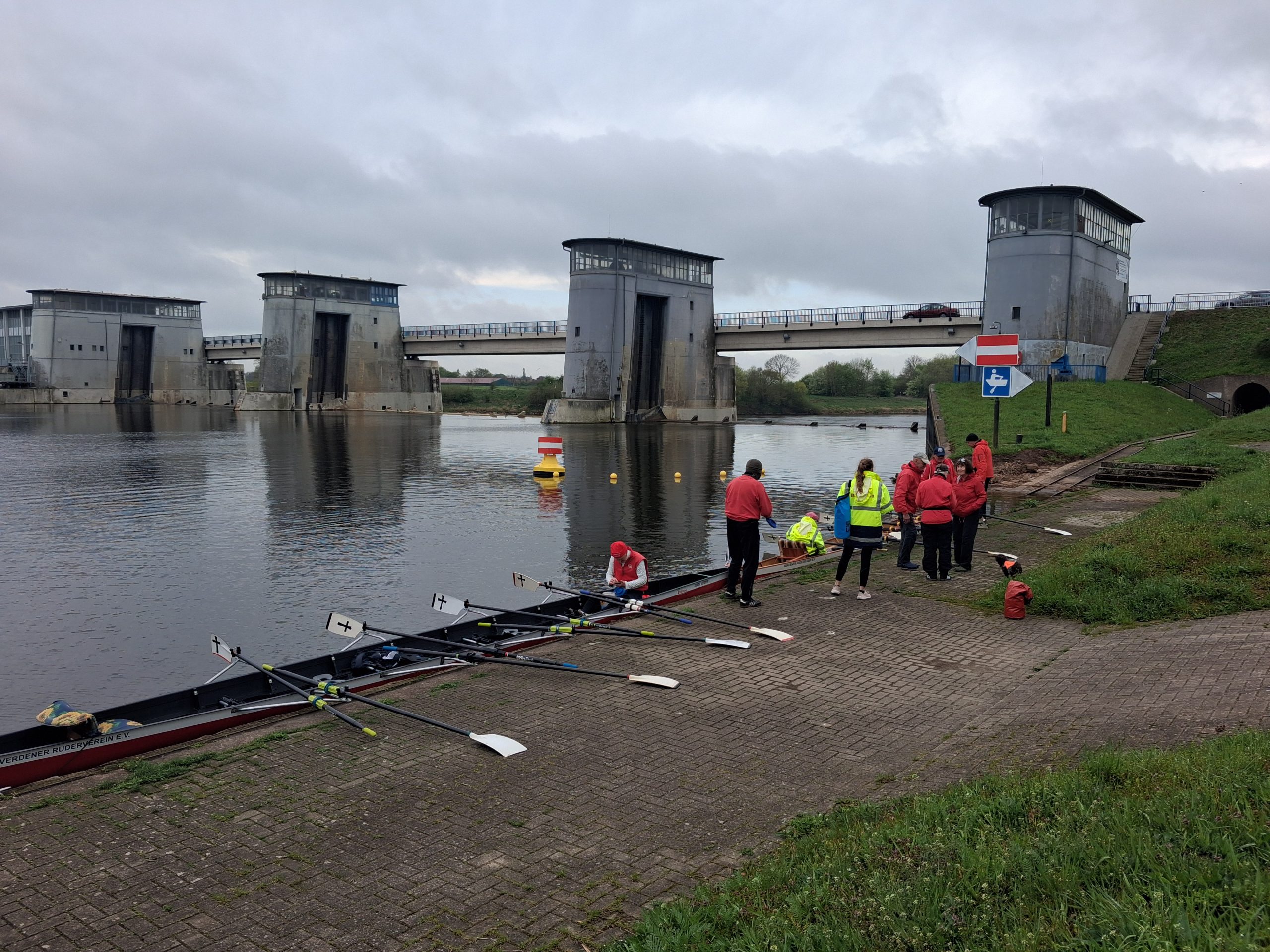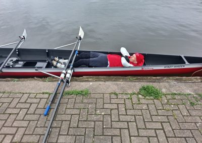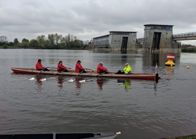 Unser Ziel war von Steg zu Steg zu rudern. Ganz unkompliziert, sind 14 Ruderfreunde bei einer leichten Südost Brise zum Wendepunkt am Intscheder Wehr gerudert. Hier konnte man aussteigen, sich strecken, eine notwendige biologische Pause machen und die Sitzordnung für den Weg zurück zum Bootshaus neu einteilen.