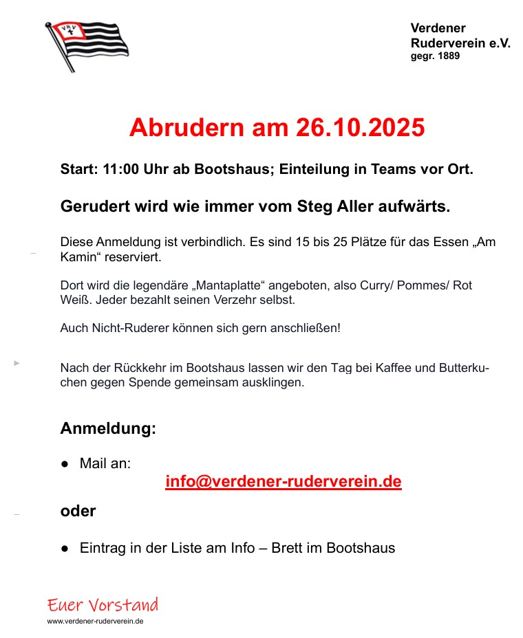 Die Anmeldungen zum diesjährigen Abrudern haben begonnen. Termin 26.10.2025, ab 11 Uhr von BS-B | Sep. 29, 2025 | Allgemein
