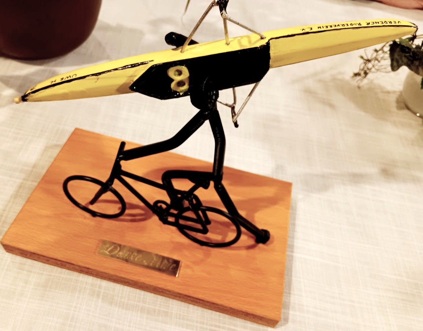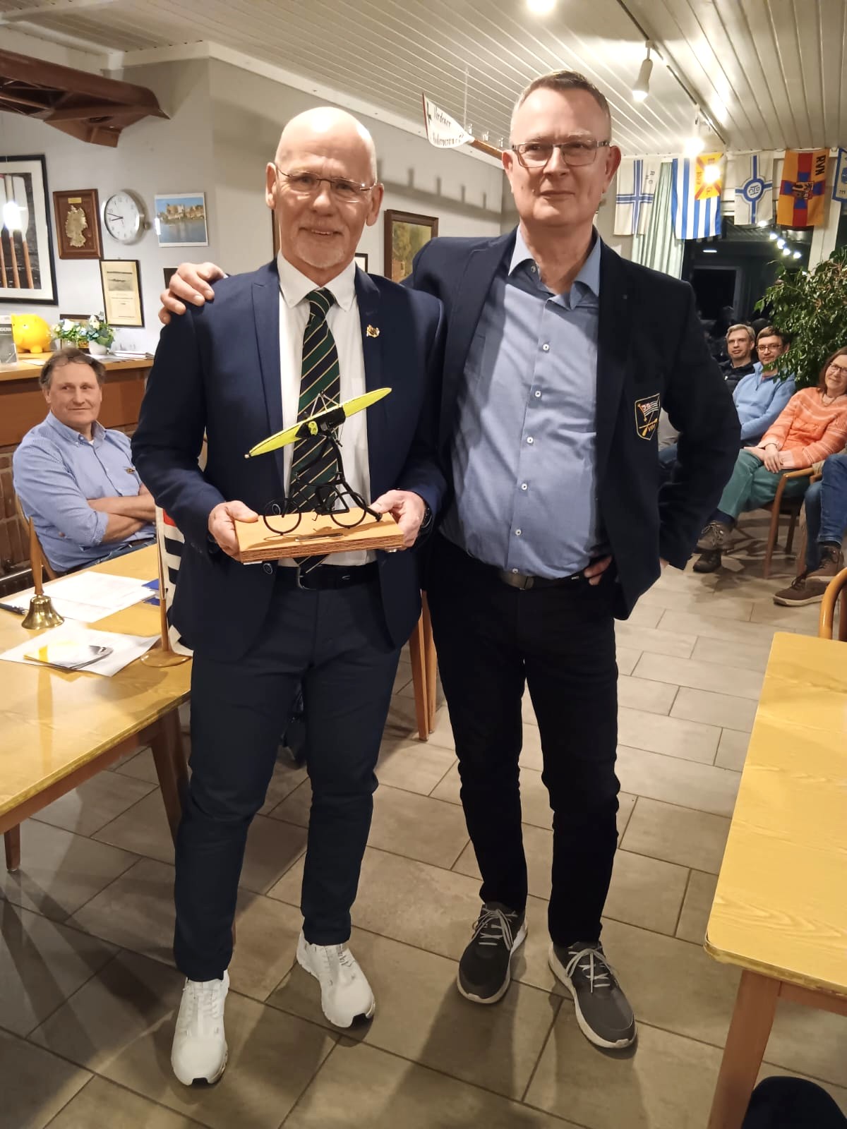 Ein besonderes Zeichen der Wertschätzung setzte schließlich der neue Vorsitzende John Boyt, der seinen Vorgänger Uwe Hollmann mit einem symbolischen Geschenk – „Vielseitiger Sportler“ – ehrte. Dieses Modell stand stellvertretend für Hollmanns enorme Energie, Vielseitigkeit und kreativen Einsatz im Verein. In sechs Jahren an der Spitze hat er den VRV souverän durch bewegte Zeiten geführt – darunter die Pandemie und das Hochwasser 2024 – und dabei nie seine Begeisterung für den Sport verloren. Ob im Rennboot, auf dem Rennrad, beim Ironman, beim Stadtlauf oder auf der Yogamatte: Uwe Hollmann steht für Bewegung, Motivation und Teamgeist.